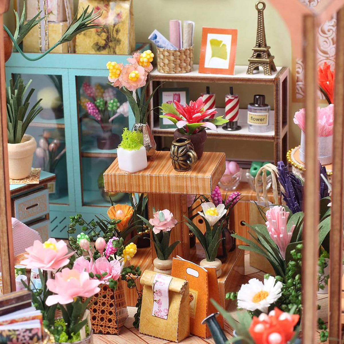 Blocos de Montar Construção de Casas Livraria Madeira DIY Brinquedos Com Luz LED e Capa (Sala de Flores) KJ9053JZ